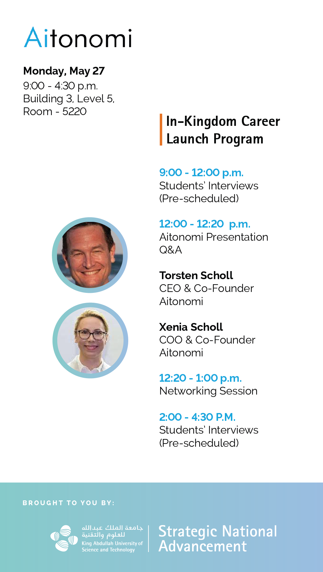Led by Aitonomi co-founders Torsten and Xenia Scholl, the upcoming In-Kingdom Career Launch Program (IKCLP) Company Day will highlight a spectrum of enticing employment opportunities, exemplifying KAUST’s steadfast commitment to nurturing a proficient workforce aligned to economic growth and the Vision 2030 Human Capital Development Program.