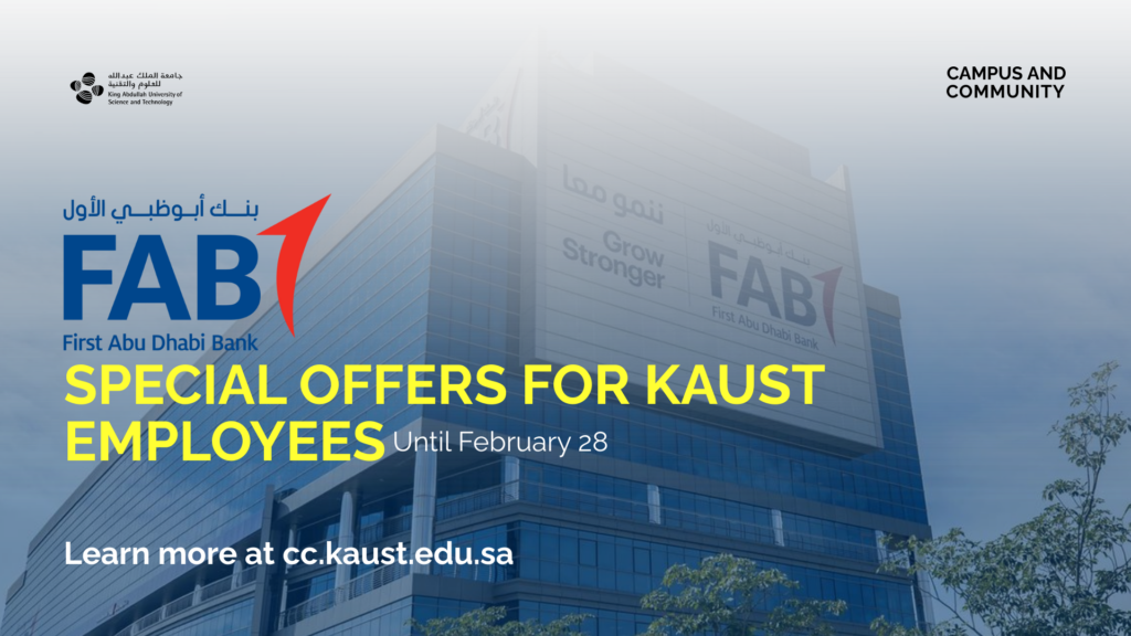 Campus and Community (C&C) is pleased to announce that First Abu Dhabi Bank (FAB) is offering exclusive benefits for KAUST employees. Don’t miss out! These offers are available until February 28.