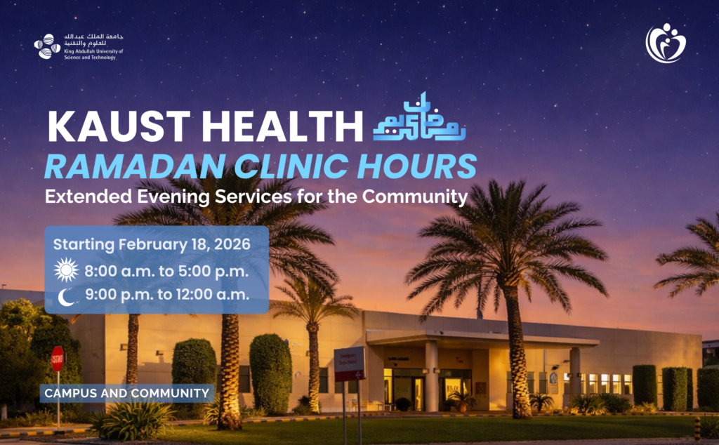 KAUST Health is pleased to offer extended evening clinic hours during Ramadan to support convenient access and ensure uninterrupted healthcare services for the KAUST community.