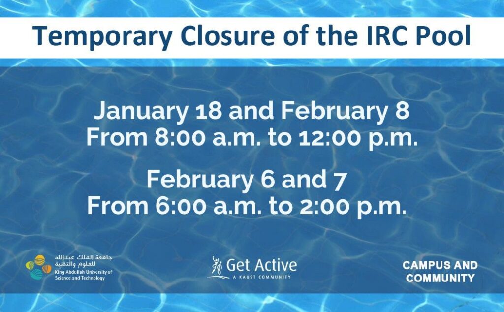 Please note that the Island Recreation Club will host the KAUST School (TKS) swimming competition on February 6 and 7. As a result, the IRC swimming pools will be temporarily closed according to the following schedule: