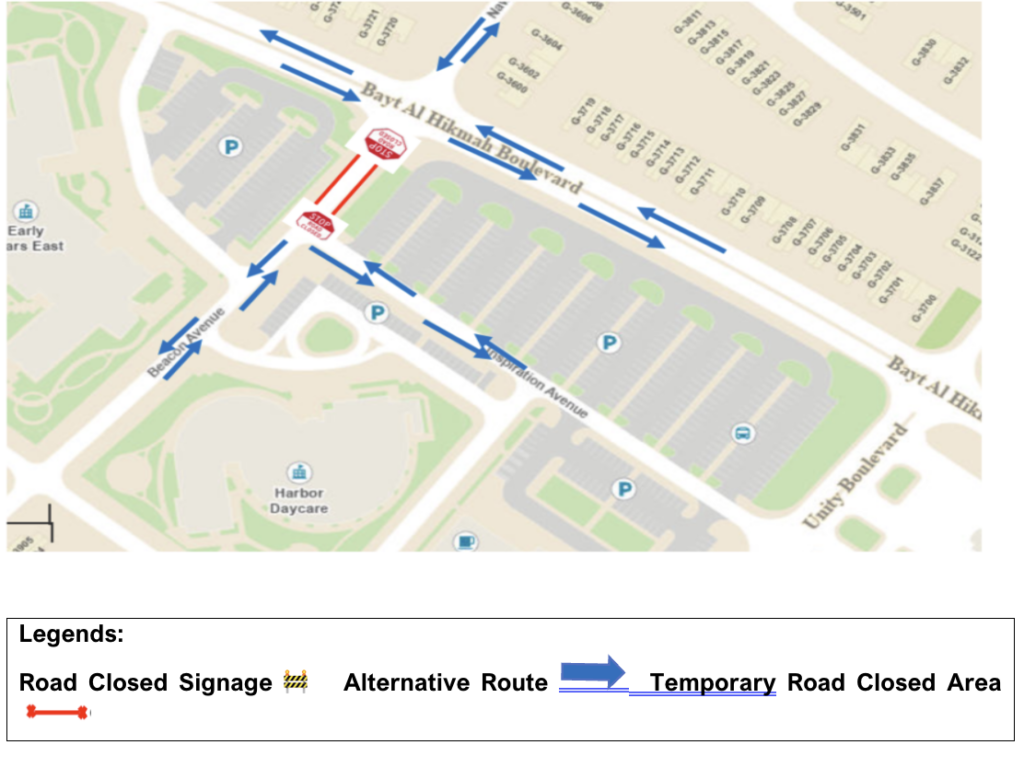 Please note that the Section of Beacon Avenue (Black Iris) Road intersection with Bayt al Hikmah Boulevard Near early years east school will be fully closed from January 01, 2026, to February 14, 2026, due to construction & repair works.